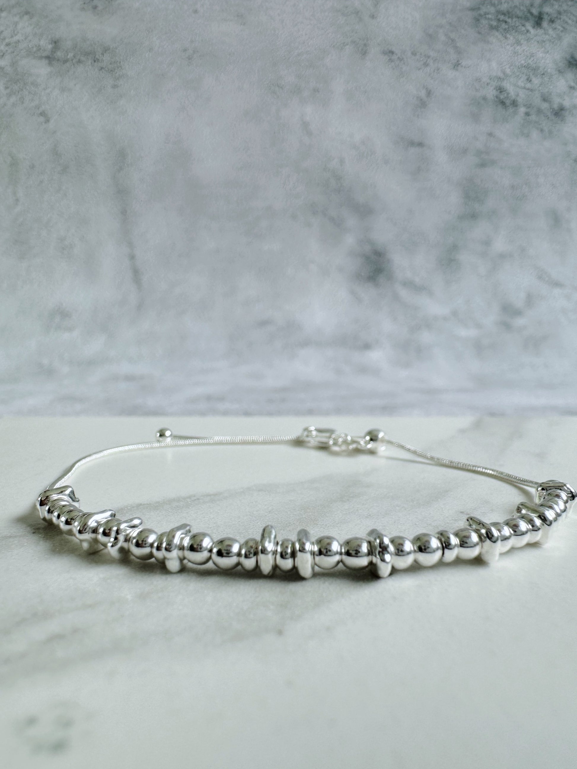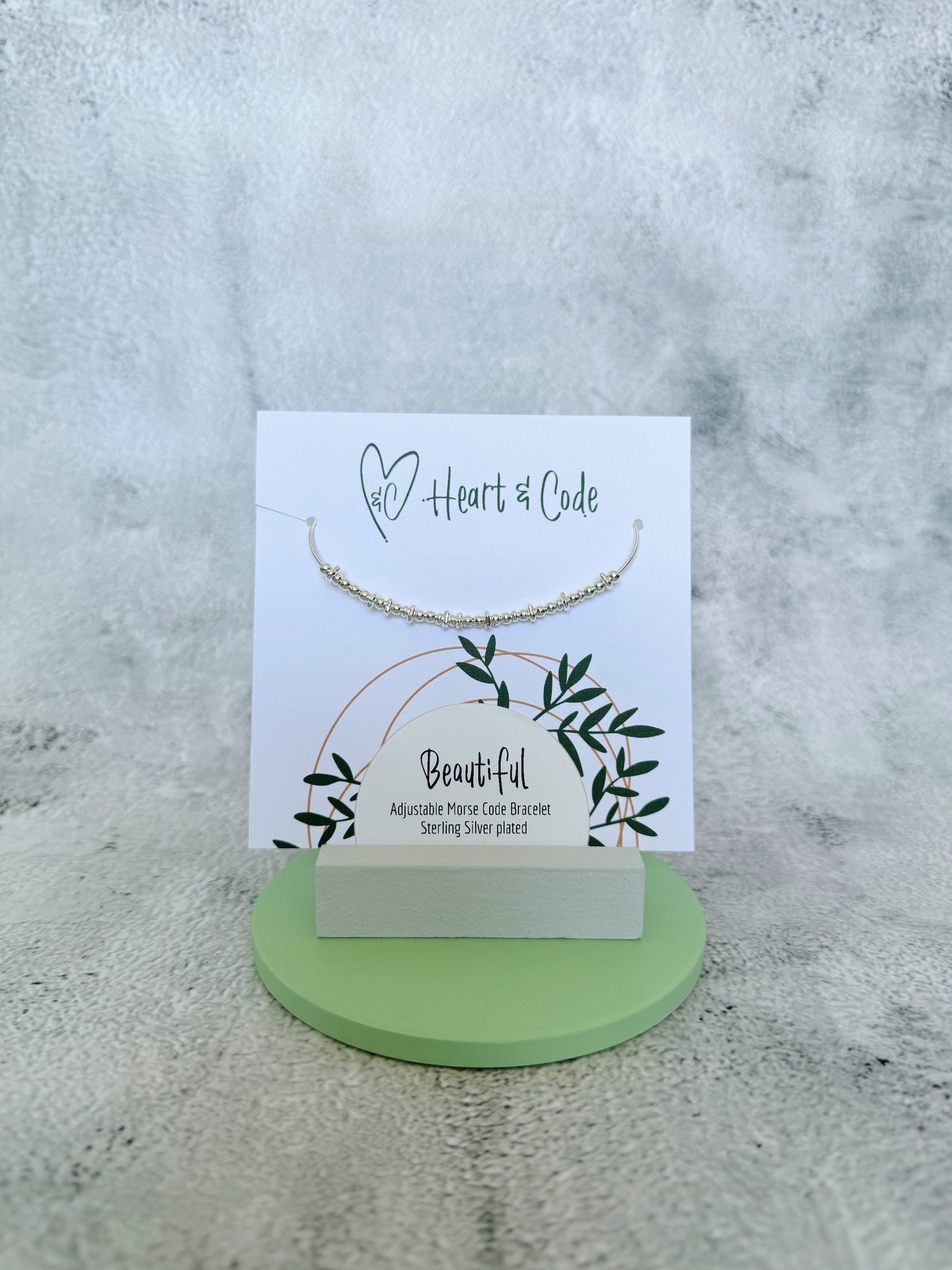 Celebrate your beauty with this sterling silver plated bracelet, featuring the message ‘Beautiful’ in subtle Morse code. Its delicate snake chain and adjustable sliding bead stopper allow for a perfect fit, reminding you of your uniqueness and grace every time you wear it.
