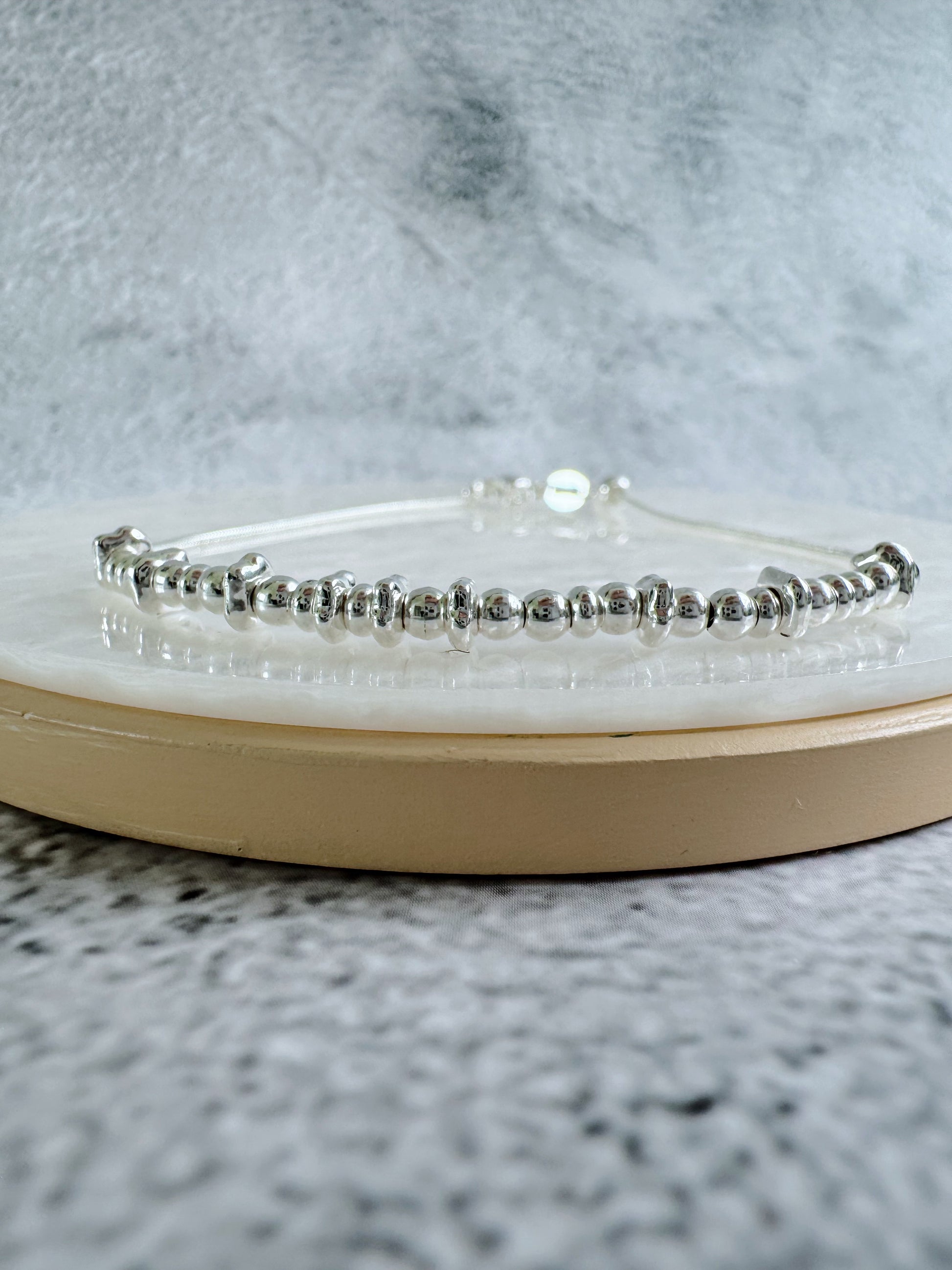 Celebrate gratitude with this sterling silver plated bracelet featuring the message 'Grateful' in subtle Morse code. Its delicate snake chain and adjustable sliding bead stopper ensure a perfect fit, reminding you to appreciate life's moments every time you wear it.