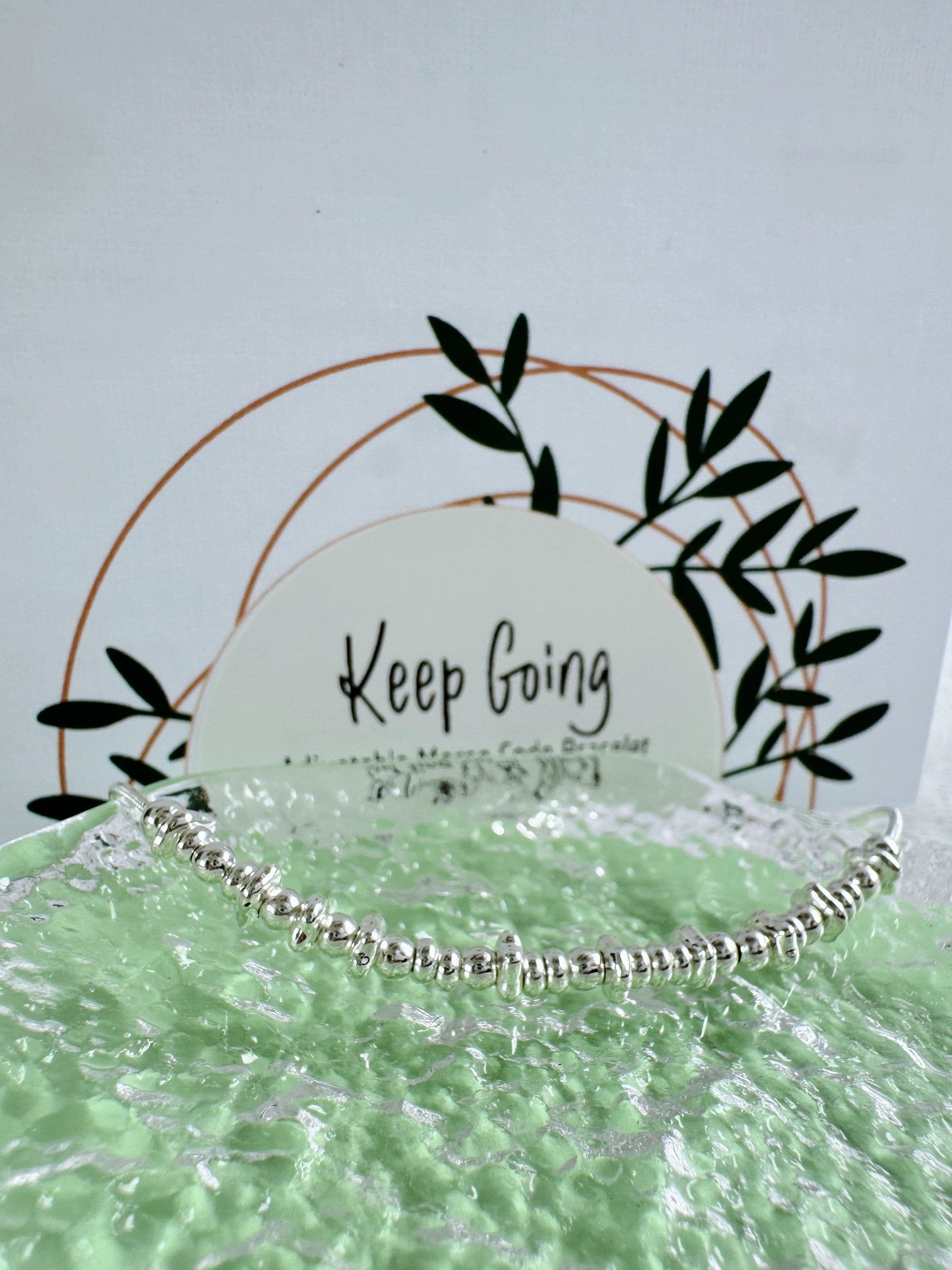 Stay motivated with this sterling silver plated bracelet featuring the message 'Keep Going' in subtle Morse code. Its delicate snake chain and adjustable sliding bead stopper allow for a perfect fit, reminding you of your strength every time you wear it.