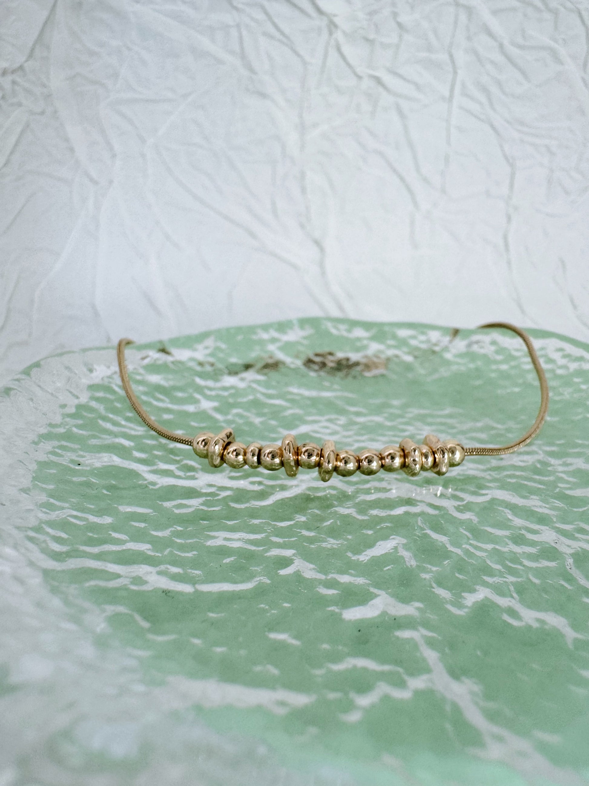 Embrace the power of rest with this 14K gold plated bracelet featuring the message 'Rest' in subtle Morse code. Its delicate snake chain and adjustable sliding bead stopper ensure a perfect fit, serving as a daily reminder to pause and take a breath.