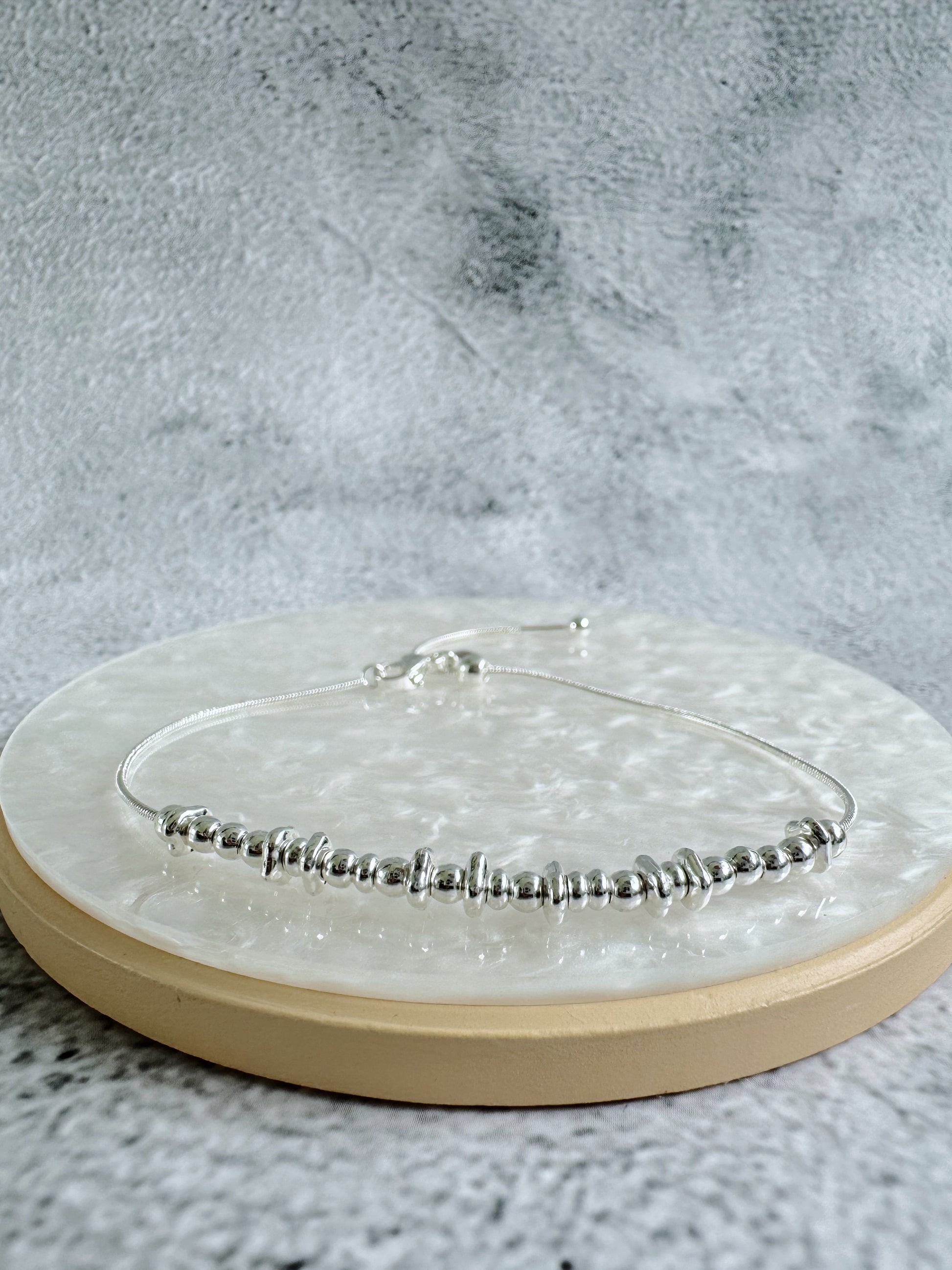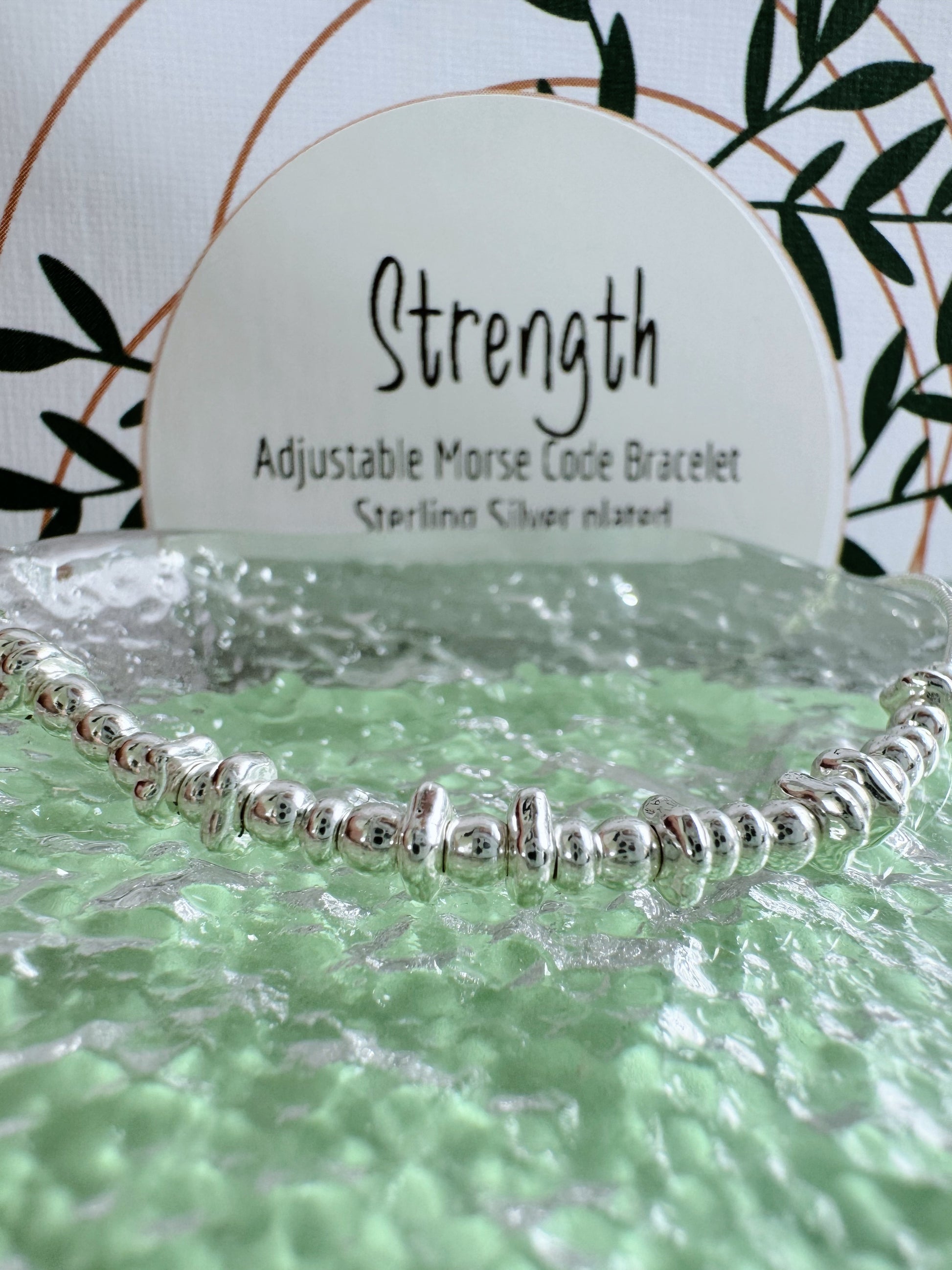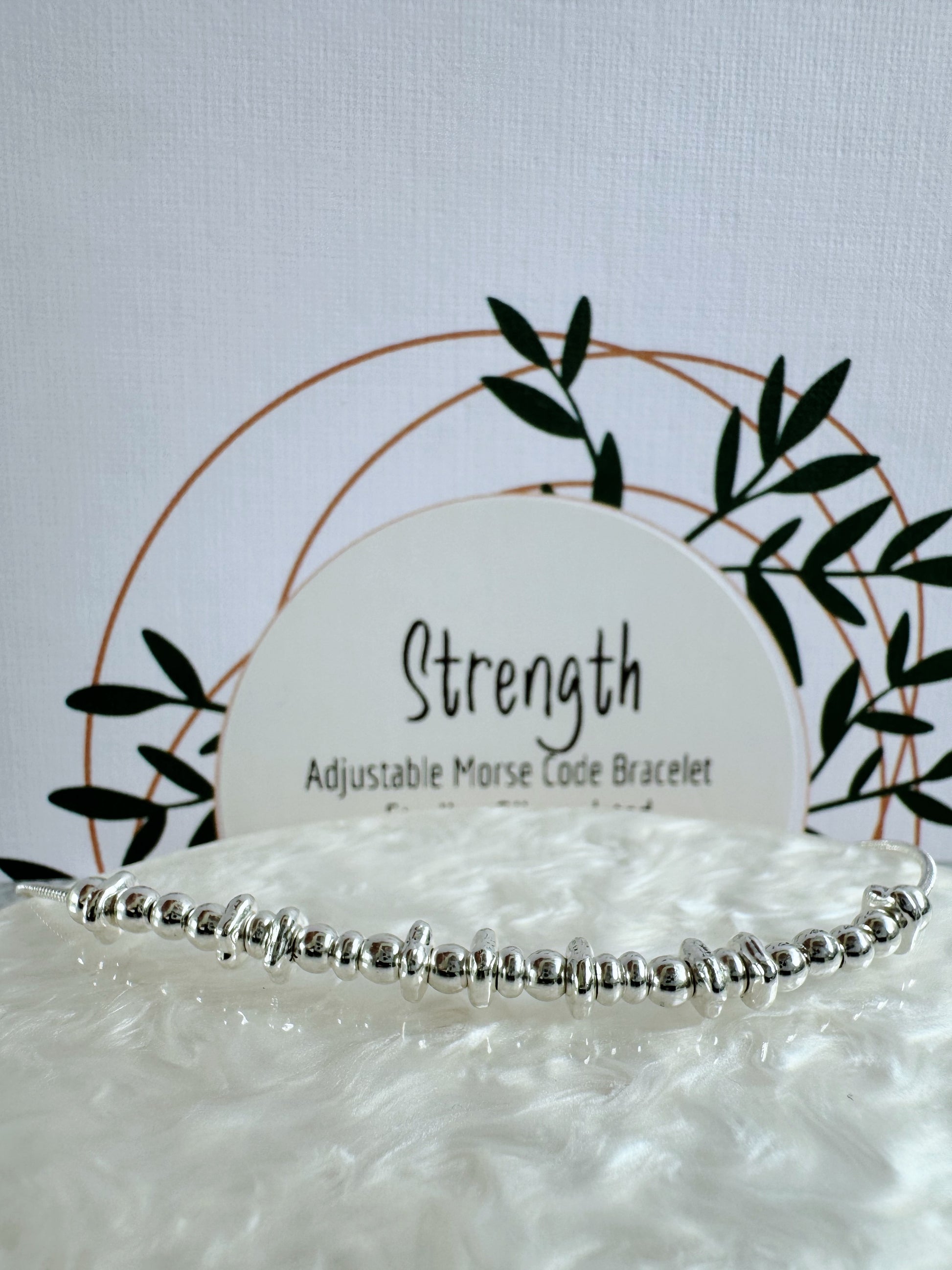 Embrace strength with this sterling silver plated bracelet, featuring a subtle Morse code message. The delicate snake chain and adjustable sliding bead stopper ensure a perfect fit, offering a personal reminder of resilience every time you wear it.