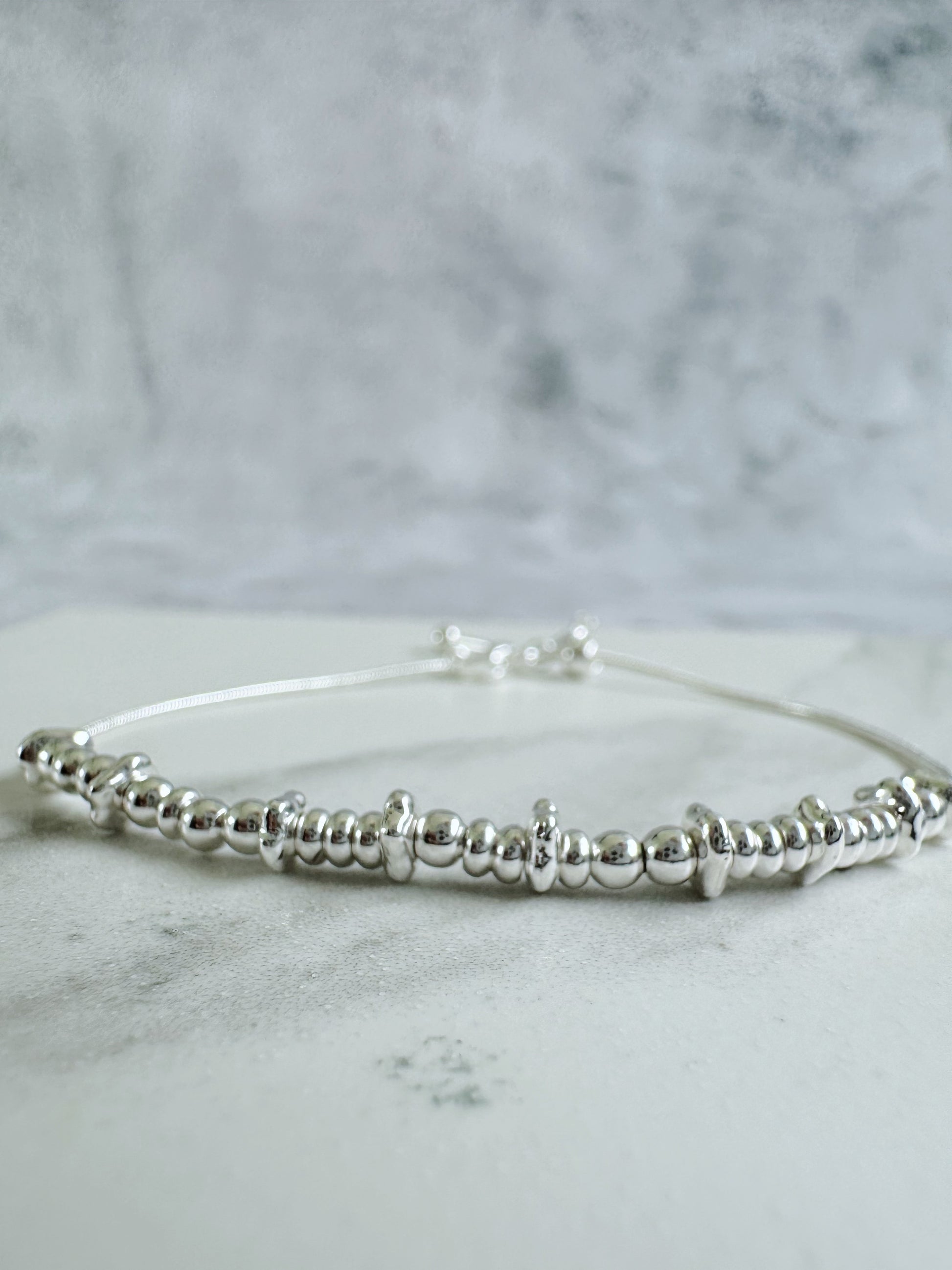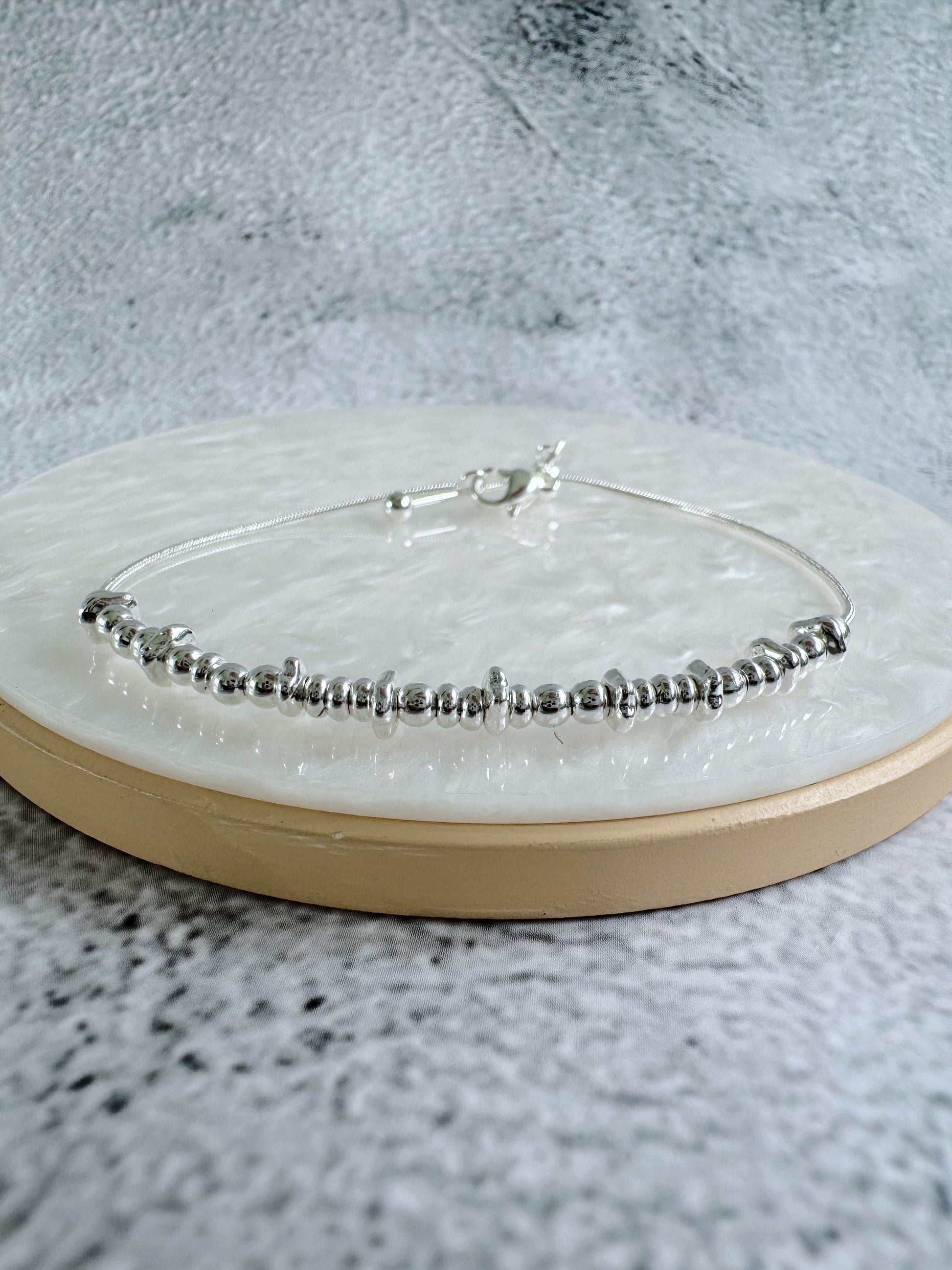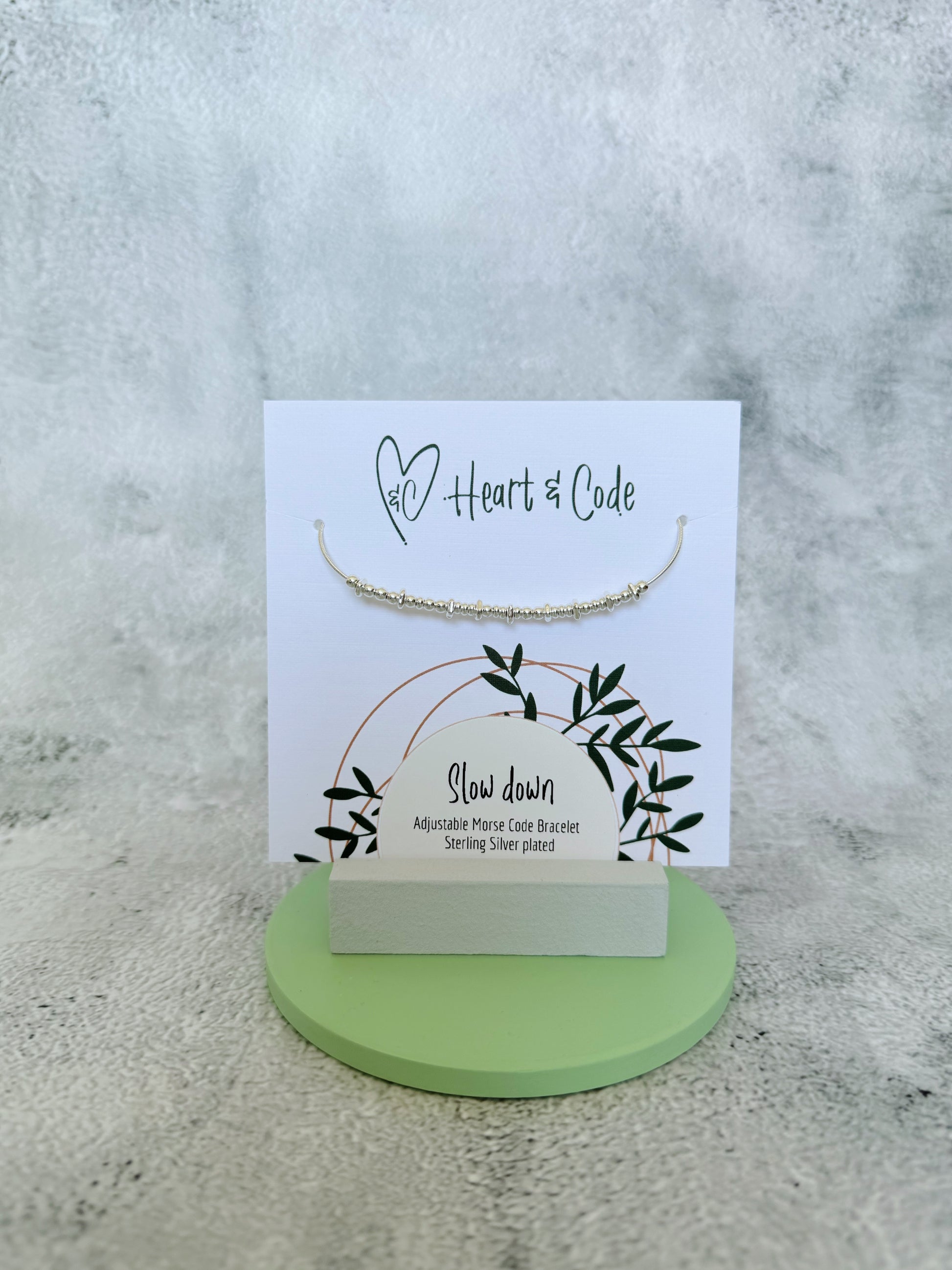 Take a moment to breathe with this sterling silver plated bracelet, featuring the message ‘Slow Down’ in Morse code. The elegant snake chain and adjustable sliding bead stopper provide a perfect fit, gently reminding you to pause and find calm in the busyness of life.